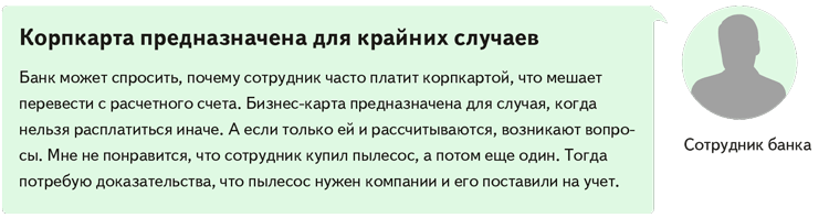 Банкиры пояснили, на какие платежи картами обратят внимание. Например, если командированный оплачивает счет в кафе, это нормально. Но если он покупает технику в большом количестве, это уже странно. Тогда банк поинтересуется, почему надо оплачивать покупки именно картой, и потребует доказательства, что компания использует эти вещи в работе. Если у вас есть выбор, как платить — с карты или со счета компании, теперь лучше выбирать второй вариант. Тогда не придется лишний раз объясняться с банком. Ведь из-за расчетов картой теперь можно даже попасть под уголовку.