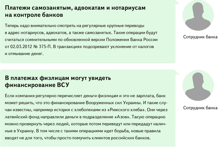 Платежи физлицам. Под повышенное внимание банков попадут крупные регулярные выплаты физлицам. Особенно оплата услуг нотариусов и адвокатов. Исключение — зарплата и кредиты. Контролерам давно уже не нравится, как бизнес работает с самозанятыми.
