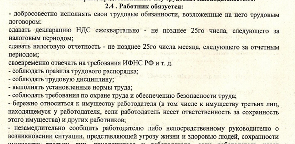 В трудовом договоре было закреплено, что бухгалтер обязан добросовестно исполнять свои трудовые обязанности. Казалось бы, в эту формулировку входит и качественное ведение бухучета. Только вот дальше через двоеточие детализировали, что речь идет о сдаче налоговых деклараций и своевременной подготовке ответов на требования из ИФНС. На этом из четких, профессиональных обязанностей все. Базовую обязанность бухгалтера – качественное ведение учета – в договоре не закрепили.