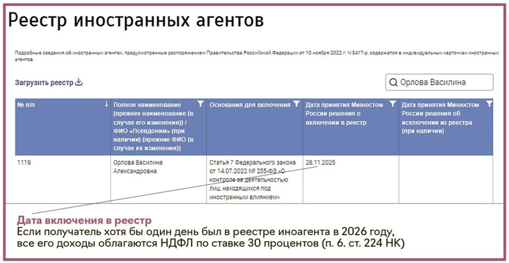 В чем сложность: С 1 января 2026 года доходы физлица, хотя бы один день имевшего статус иноагента, облагаются НДФЛ по ставке 30%. Вычеты им не положены. Минюст обновляет реестр еженедельно.