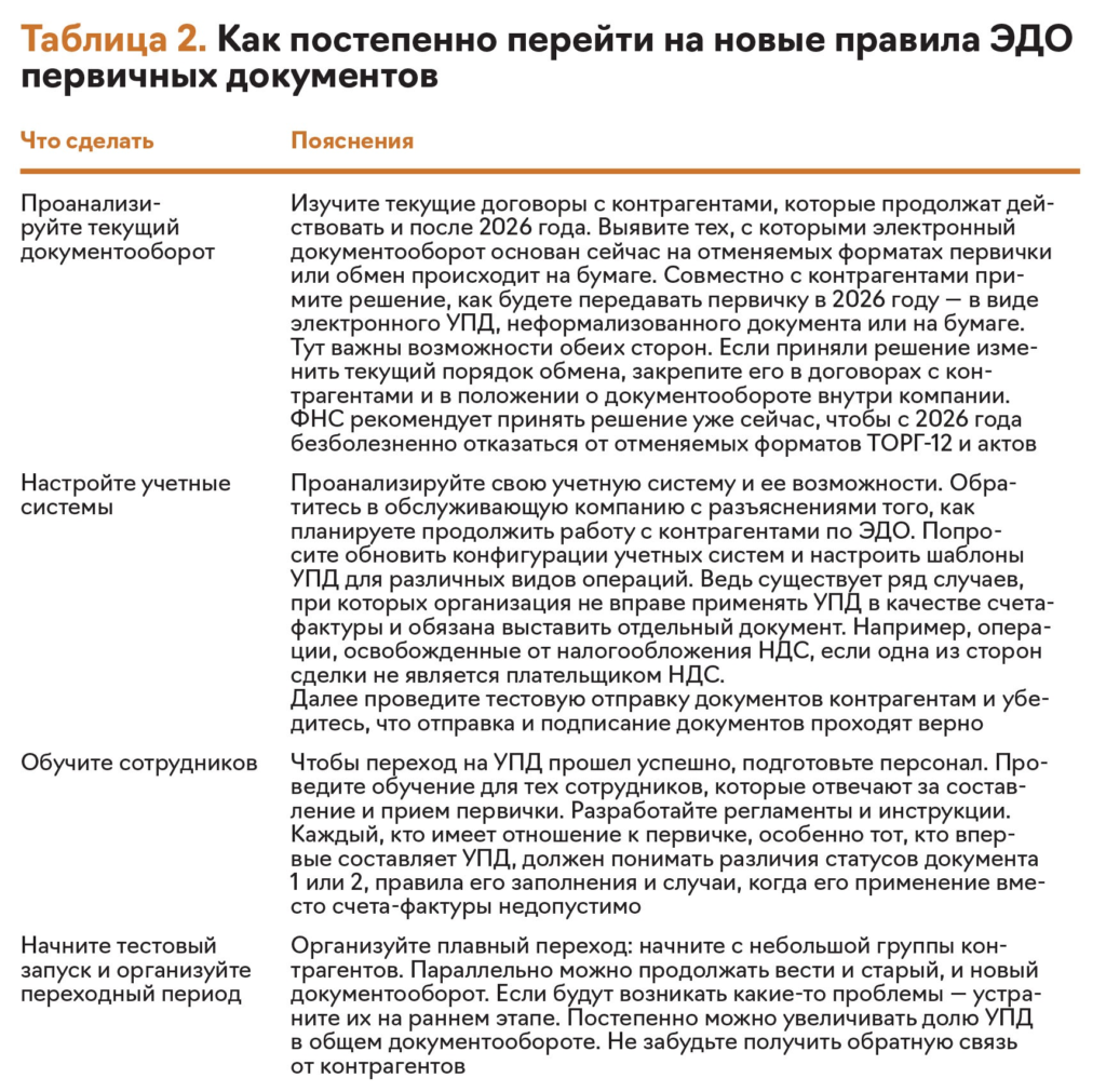 Как перестроиться компании. Универсальный передаточный документ — уже хорошо знакомый формат. Его действующая версия 5.03 утверждена приказом ФНС от 19.12.2023 № ЕД-7-26/970. И переход на него не вызовет трудностей. Но чтобы уже в 2026 году все работало без перебоев, следуйте плану в таблице 2.