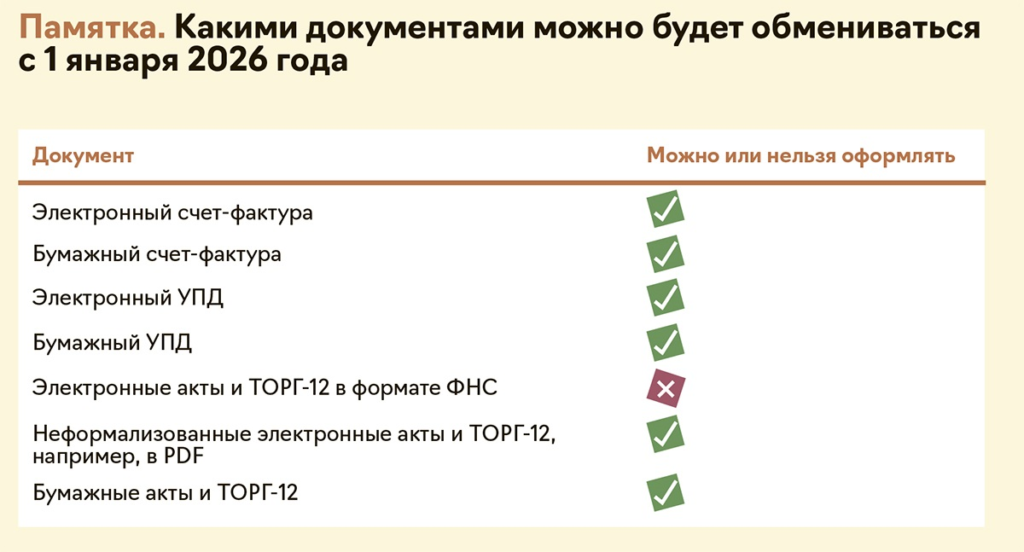 Например, если сейчас вы обмениваетесь с контрагентами бумажными актами и электронными счетами-фактурами, то можно продолжать работать так же и в 2026 году. Но если оба документа уходят в электронном виде, их придется заменить на УПД.