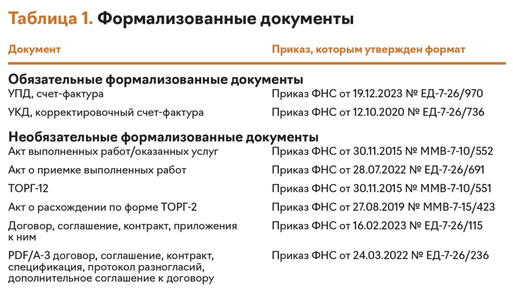 Формализованные документы. Формализованные документы составляют в формате XML, утвержденном ФНС. Это машиночитаемый формат, который ускоряет обработку документа. Формализованные документы бывают обязательные и необязательные. К обязательным относят счета-фактуры, УПД, корректировочные счета-фактуры и УКД. Их всегда нужно передавать по утвержденному ФНС формату (п. 2 Порядка, утв. приказом Минфина от 05.02.2021 № 14н). Перечень часто используемых формализованных документов ищите в таблице.