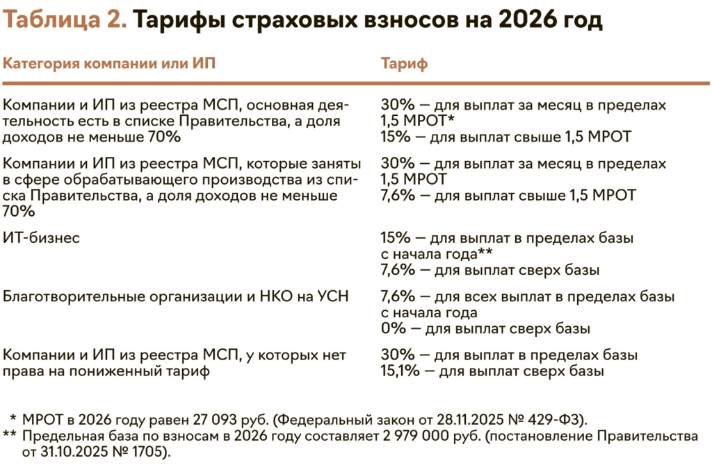 Определитесь с тарифом взносов. Первым делом поручите проверить, вправе ли организация или ИП применять пониженный тариф по взносам в 2026 году или придется начислять по общим (см. таблицу 2). Размер общего тарифа в 2026 году — 30 процентов с выплат в пределах базы 2,979 млн руб., свыше этой суммы — 15,1 процента. Также действуют пониженные тарифы 15 и 7,6 процента. Проверьте, выполняются ли у вас условия для пониженного тарифа.