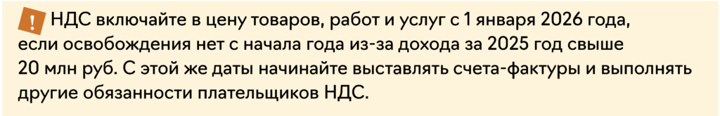 Убедитесь, что не потеряли право на освобождение. Вы теряете право на освобождение в 2026 году, если получите доходы свыше 20 млн руб. (п. 1 ст. 145 НК). В этом случае придется платить НДС с начала следующего месяца. Что при этом делать, передайте подраздел с ежедневными обязанностями. Если освобождения по НДС не было с начала года, переходите к следующему подразделу.