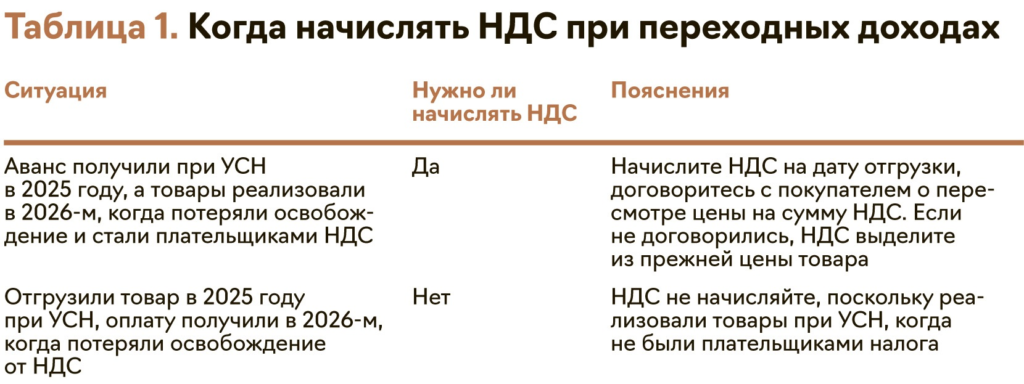 Разберитесь с переходными доходами. Переходные доходы возникают, если начали выполнять договор в 2025 году, когда еще не платили НДС, а закончили в 2026-м, когда стали плательщиком. Например, аванс получили при УСН в 2025 году, а товары реализовали в 2026-м. Тогда начислите НДС на дату отгрузки (см. таблицу 1) — дайте задание команде подготовить инструкцию по таким случаям.