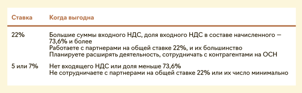 В другой компании выбрали пониженную ставку, так как не хотели высчитывать входной налог, зависеть от поставщиков — собирать документы для вычетов. Решили, что 5 процентов — лучший вариант. На деле ставка 5 процентов оказалась невыгодна невыгодна. Входной НДС был почти во всех поставках, и мы могли бы снизить на него налог. Плюс партнеры просили счета-фактуры с НДС по ставке 22 процента, а из-за отказа перестали сотрудничать с нашей компанией.