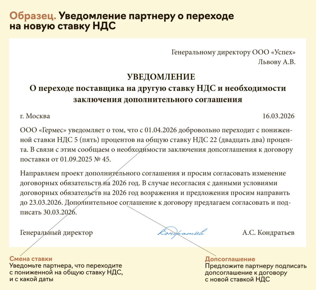 Ставку НДС нужно сменить с 1 апреля. Оповестите поставщиков, внесите изменения в договор, согласуйте новую цену (образец см. ниже). Из-за смены ставки цена для клиентов изменится. Вы должны увеличить или уменьшить цену в зависимости от новой ставки НДС с 1 апреля. В ИФНС уведомление о смене ставки не подавайте, выбранную ставку налоговики узнают из декларации за 2-й квартал.